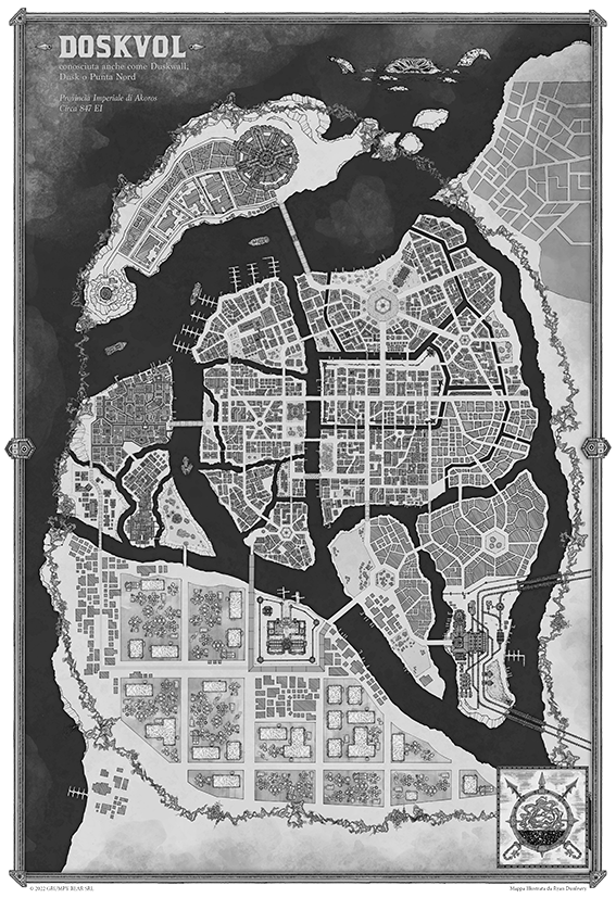 Una mappa 70 x 48 cm con il dettaglio della pianta della città di Doskvol sul fronte e le Isole Infrante sul retro.
